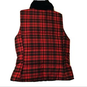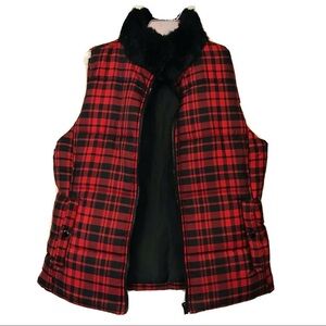 Chaps Puffy Quilted Vest Faux Fur Collar Red Black Buffalo Plaid Zip Front Womens Sz M