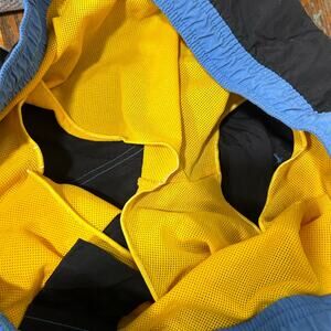 Chaps Ralph Lauren Mens Sz XL Black & Blue Swim Trunks Beach Y2K Preppy Summer. The shell is 100% nylon and the lining is 100% polyester. The waist measures 36 inches, the rise is about 13.5 inches and the inseam is 7 inches. In excellent condition.