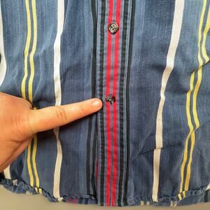 Multicolor vertical stripes, chest logo, and a comfy relaxed fit make it a classic. One button is broken, but extra original buttons are included so you can swap it out easily. 100% cotton, made in Indonesia.
