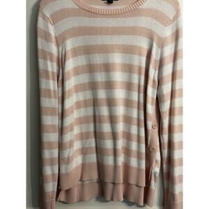 This Chaps Ralph Lauren Striped Pink/White Sweater in size XL is a stylish and comfortable addition to any woman's wardrobe. Made with a knit fabric of 60% cotton and 40% modal, this tunic-style sweater features a classic round neck and pullover closure. The side buttons add a touch of detail to the design, while the long sleeves make it suitable for casual occasions in the summer, fall, or spring. With a colorful striped pattern and a length of 26" front - 27" back, this sweater embodies a preppy old money academia vibe. Machine washable and easy to care for, this sweater is a versatile and timeless piece for any fashion-conscious woman.