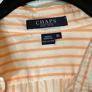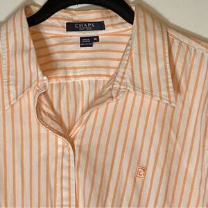 Beautiful and lightweight Chaps Ralph Lauren women’s pink/white button up shirt. Made of 100% cotton, and a size XL, this shirt is perfect for the warmer days of spring!