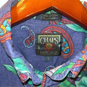 Chaps/ Ralph Lauren Vintage Men’s button down shirt, chest pocket, short sleeve, size large, 100% Cotton, blue with paisley design