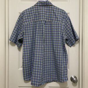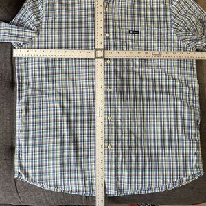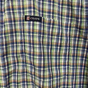 This is a Chaps Easy Care Short Sleeve button down shirt in a mens size X-Large. It is a plaid print with blue, green, orange and white. It is 60% cotton and 40% polyester. This shirt is in excellent preowned condition with no signs of wear. Measurements are included in photos.