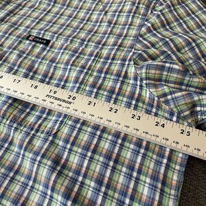 This is a Chaps Easy Care Short Sleeve button down shirt in a men's size X-Large. It is a plaid print with blue, green, orange and white. It is 60% cotton and 40% polyester. This shirt is in excellent preowned condition with no signs of wear. Measurements are included in photos.