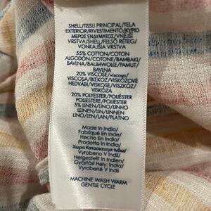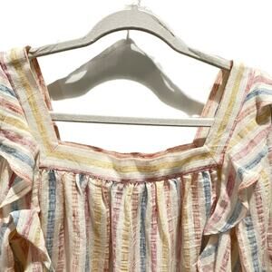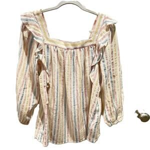 Chaps women’s blouse in size Small featuring soft pastel vertical stripes in pink, blue, yellow, and ivory. Designed with a square neckline and long sleeves with elastic cuffs. Decorative ruffle trim runs down the front on both sides, adding movement and texture to the lightweight, crinkle-woven fabric.