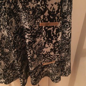 Comfy Black and White Snake print dress from Chaps. NWT. It has a zip back, defined waist with belt, and circle skirt. It is easy care with no wrinkle and is comfy. It would be a great work dress or for going out to dinner while traveling. It is a size 14, I feel like it fits more like a 12 but it has some stretch and a belt so it probably could work for several sizes. It measures approx. 19 1/2 inches armpit to armpit and about 18 1/2 inches across the defined waist when measured flat.