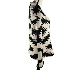 A statement cardigan that transforms layering with its bold geometric pattern, offering warmth and visual intrigue through its contrasting black and white zigzag design.
