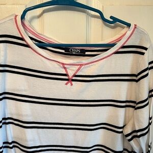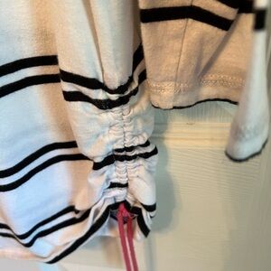 Size: XL Really comfortable, casual top fits nice with the drawstring on the sleeves and bottom sides of the shirt. Like no tears or stains.