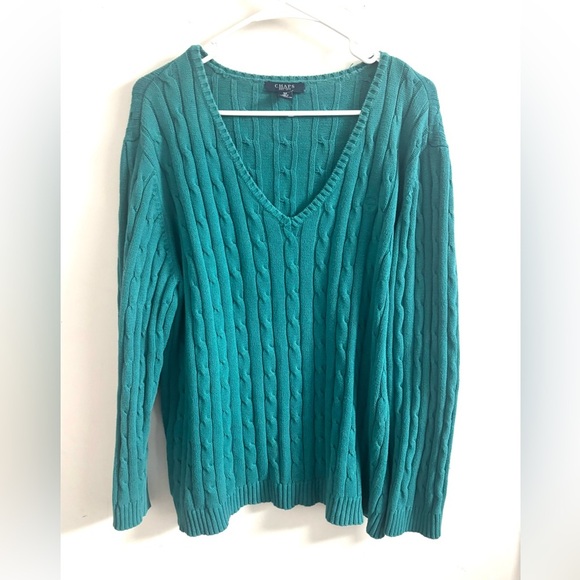 Chaps Sweater Women’s V-Neck Size 3X Teal Green Cable Knit Old Money Preppy