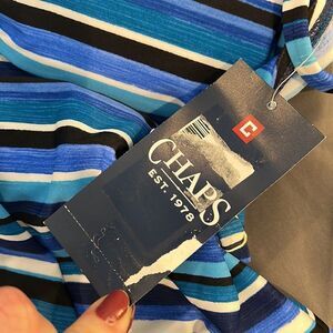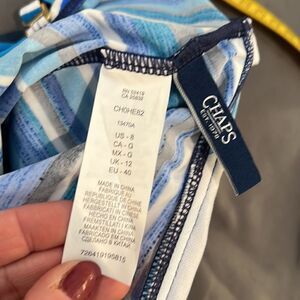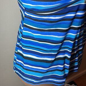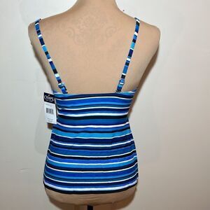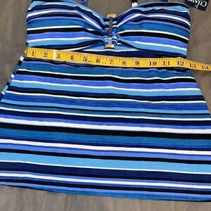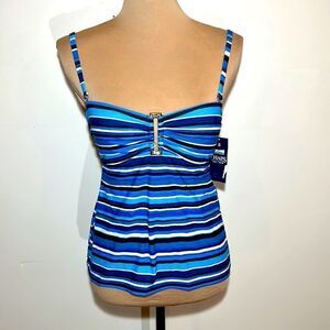 Blue, white, and black striped tankini top with gold hardware at the chest. Features adjustable and removable straps and cups with removable pads.