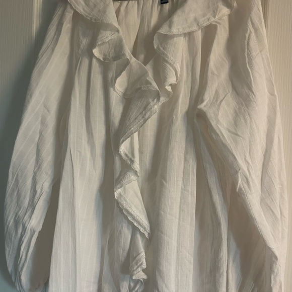 Elegant white blouse with ruffled front. Long sleeves. Lightweight fabric.