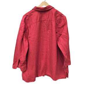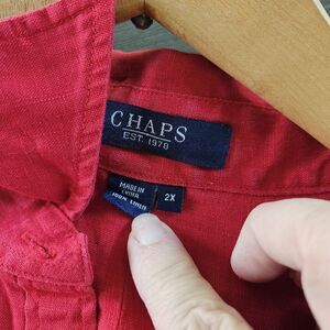 The Chaps Women Linen Top in 2X size is a stylish and comfortable piece. With a classic red color, collared neckline, and 3/4 sleeves, this button-front top is perfect for casual occasions. Made from breathable linen material. Split wrist area, does not button at wrists. Excellent condition. See pictures for measurements