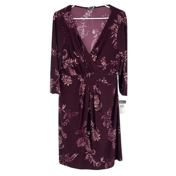 Chaps Women XL Floral Faux Wrap Dress Knee Length V Neck Burgundy Half Sleeve