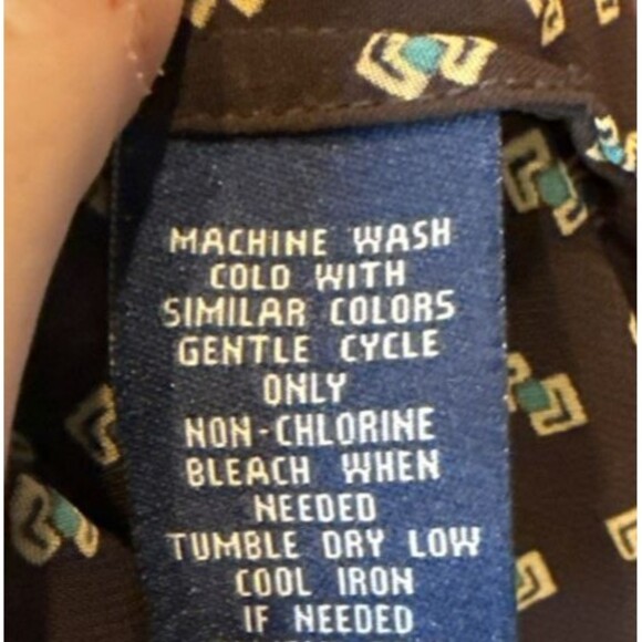Chaps women's sheer chocolate brown blouse with geometric pattern in cream and teal. 3/4 sleeves, pintuck detailing at front. 100 percent polyester, machine care. Good preowned condition.