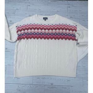 Chaps Women’s Fair Isle Sweater Large Cream Pink Red Cable Knit Nordic Winter