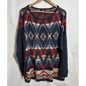 Chaps Womens Southwestern Knit Sweater L Blue Red 100% Cotton Aztec
