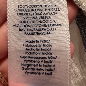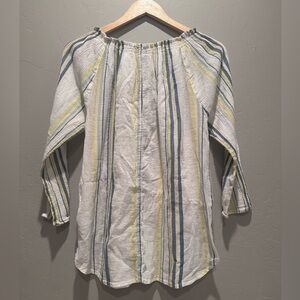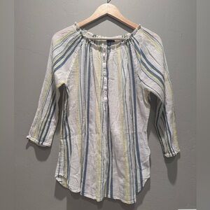 100% cotton. Button detail, ruffle neckline. Made in India. White with green and yellow stripes.