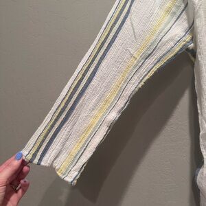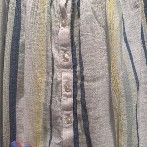 100% cotton. Button detail, ruffle neckline. Made in India. White with green and yellow stripes.