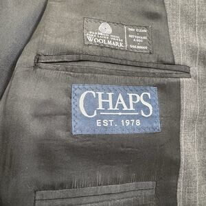 Classic gray pinstripe wool blazer by Chaps with Woolmark certification, single-breasted 2-button front, sharp tailored fit and timeless business-meets-vintage vibes. Mad Men Style. Pre-owned- This item has been gently worn and is in nice condition. Minor wash wear consistent with age. No rips, no tears, no stains. Refer to images for condition. Due to light and screen difference, the color may be slightly different from the picture.
