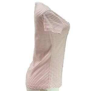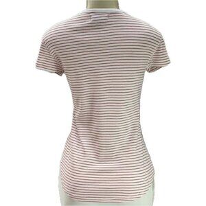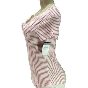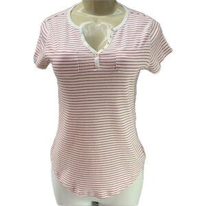 Chaps XS Red-White Striped Split Neck Pocket Cotton Curved Hem Short Sleeve Top