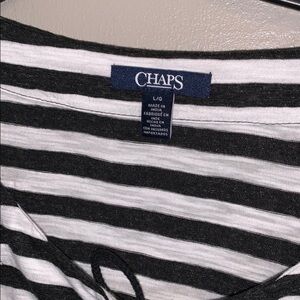 Brand new with tags from chaps! This black and white striped t-shirt has bubble sleeves, long-sleeves, is 97% cotton and 3% polyester. 2” slit on each side on the bottom. The neckline has three criss-crosses and ties at the very top or can leave open! Size large.