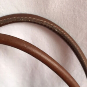 Chaps black nylon bag with brown trim, silver-tone hardware. Good preowned condition. Some handle wear. Bag itself measures about 14” wide by 9” deep. 18” from top if handles to bottom of bag. One outside zippered pocket. Three interior compartments. Center one has a zippered pocket on one side and two open pockets on the other side.