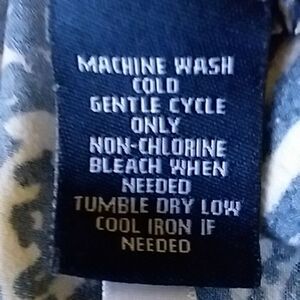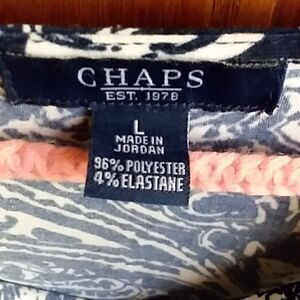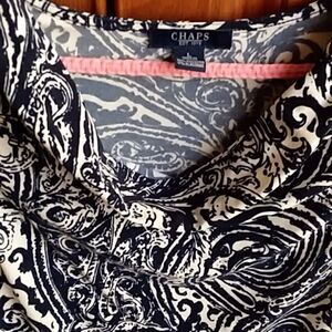 I have a beautiful Chaps blouse for sale. It is sleeveless with a draped neckline. Flattering black and white swirl design. size large and in very good condition.