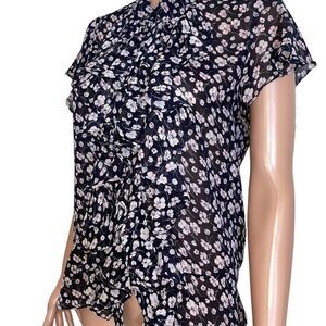 Floral blouse, ruffle front blouse, short sleeve top, button down blouse, tie neck detail, lightweight chiffon blouse, feminine work top, dressy floral shirt, office wear blouse, semi sheer blouse, romantic ruffle top, spring summer blouse