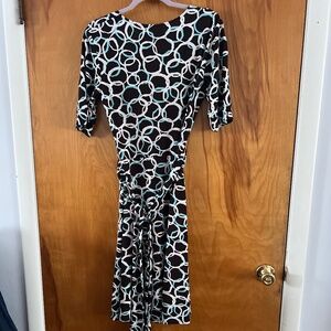Chaps brown blue white V-neck short sleeve faux wrap tie polyester dress.