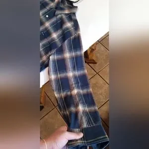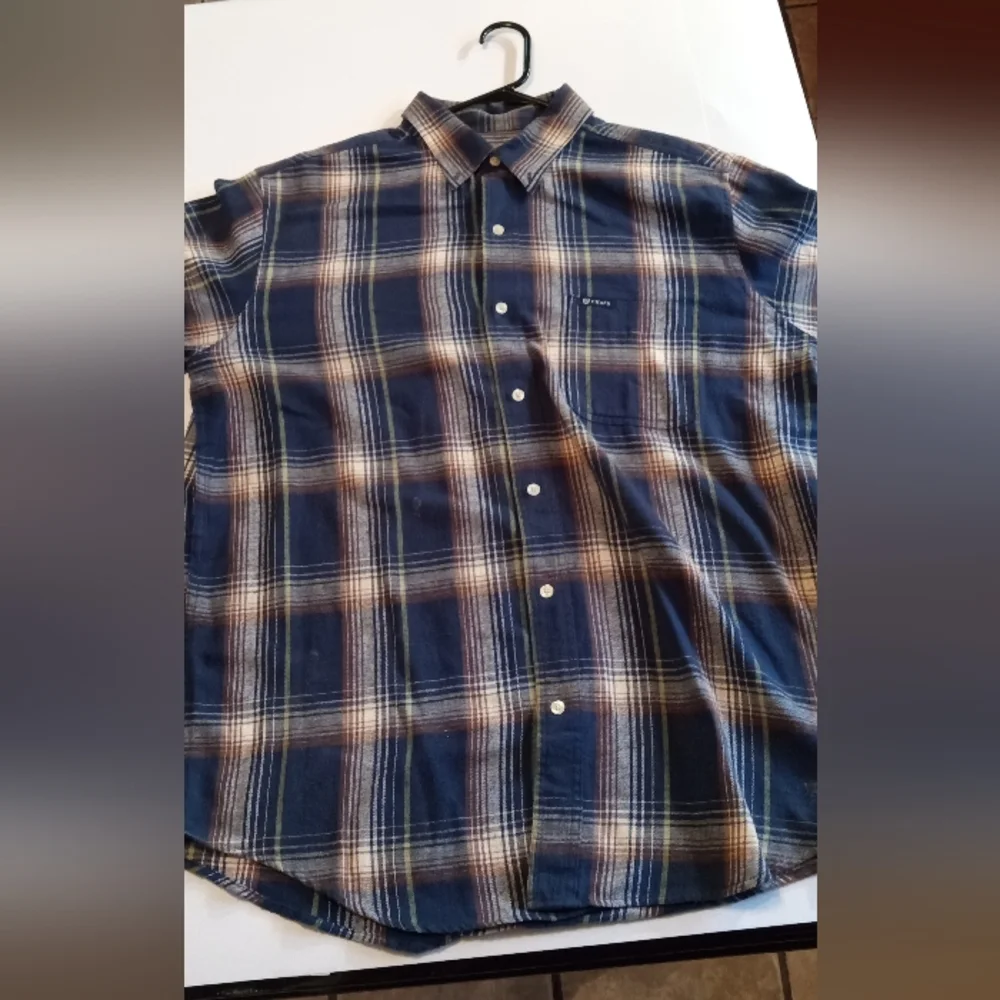 large long sleeve chaps plaid/flannel blue brown white and yellow button down in very good shape