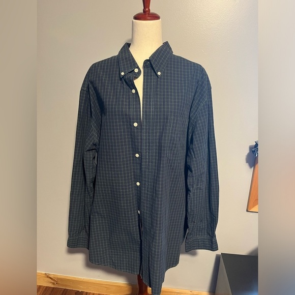 Plaid navy, green and black. In great condition, has been dry cleaned only but can be washed.