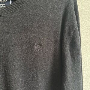 Cashmere cotton blend dark gray v-neck style sweater from the brand Chaps. Has the logo on the front. Classic style, perfect for staying comfortable and looking classy.