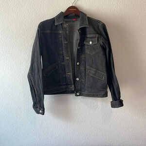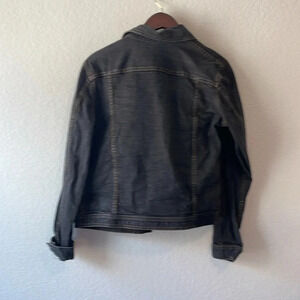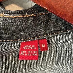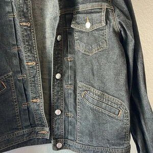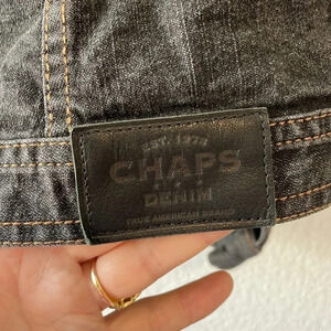 Gently worn dark wash denim jacket. Size medium. Chaps brand. Pit to pit measures 18 inches. Length from armpit to hem is 12 inches. Clean and no damage.