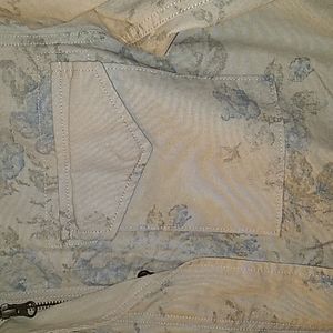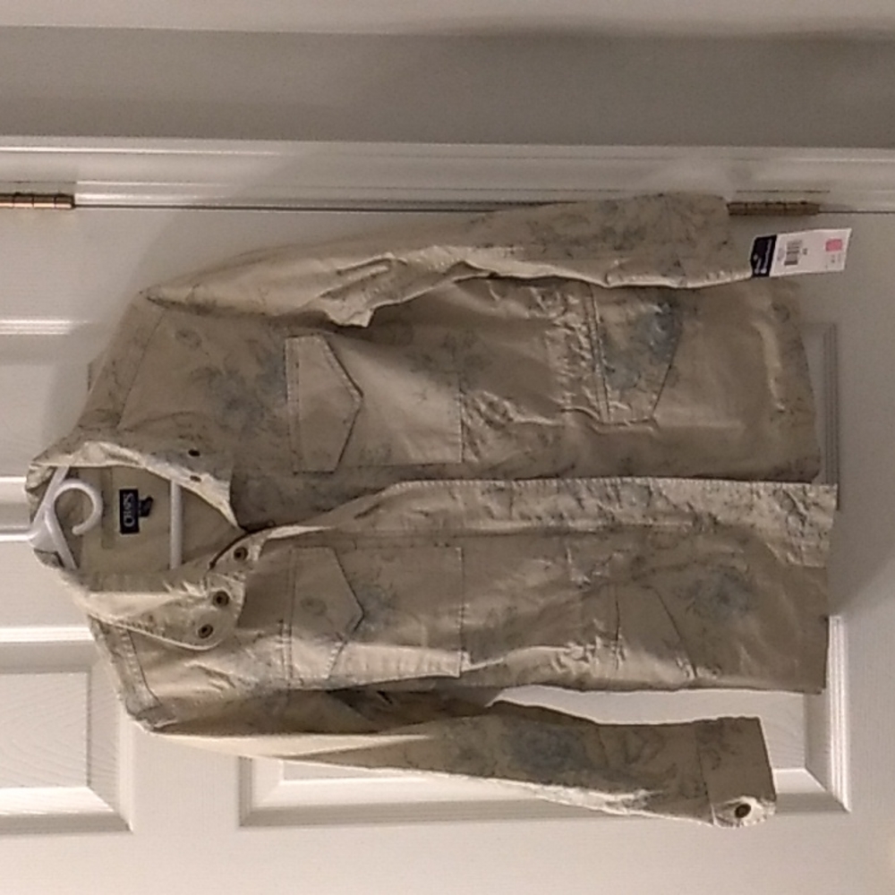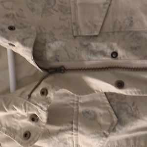 Khaki Chaps anorak jacket with blue floral design throughout. Has both Ipper and buttons up the front. Elastic at waist. Size XS.