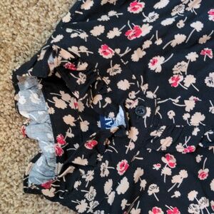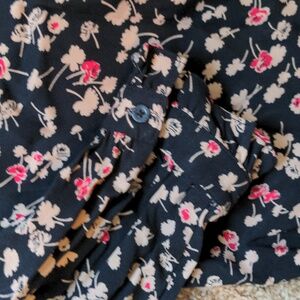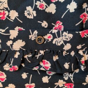 beautiful black Chaps button down with ruffle details and tan and red flower pattern. really soft material. beautiful shirt to transition into fall! EUC.
