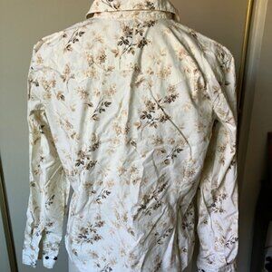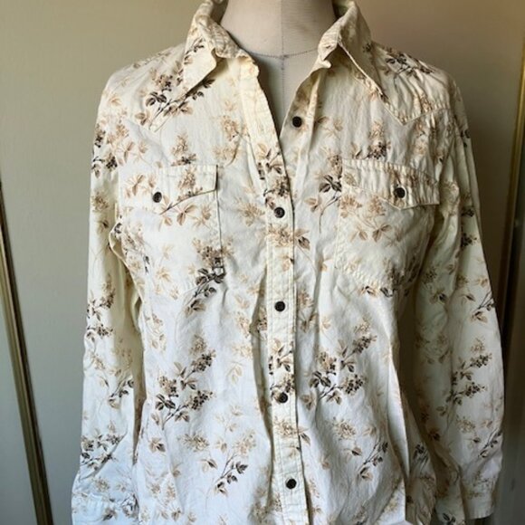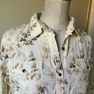 floral with a touch of cowgirl- this shirt is super cute paired with boots and leather belt! Brand Chaps size is PL (petite large) and fits super cute- not too tailored and bit roomy!Cute brown buttons and looks great with rolled up sleeves.