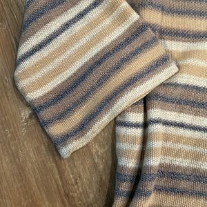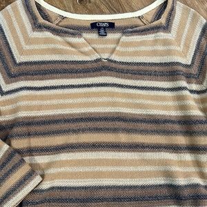 Stripe bell armed sweater by Chaps . Nice medium weight . Slit v at neck , excellent shape . Great colors for fall various shades of tan with gray size L