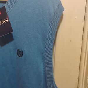Chaps sleeveless sweater vest in blue. Features a classic design with a logo detail.