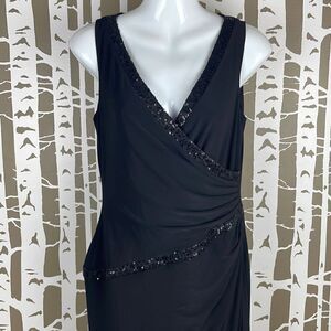 Chaps Evening Black Asymmetrical Sequin Accent Long Maxi Evening Gown sz 6 RN 41381. Features comfortable and stretchy 95% polyester 5% elastane fabric, sleeveless design, crossover V-neckline, figure flattering shirring and asymmetrical detail across waist, faux wrap front skirted area, sequin trim around neckline/front and asymmetrical sequin trim across front and back. New with tags (Retail $120) and some minor flaws - light deodorant marks from being tried on and some snagging of the fabric from rubbing against the sequins (see pics). If you are looking for a comfortable dress for your next formal event, look no further - this one packs beautifully with minimal wrinkling and would be perfect to take on a cruise!