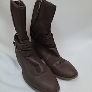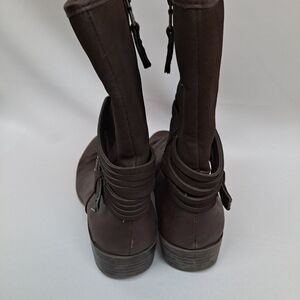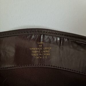 In great condition! Brown, size 6B. 1" heel, 8" shaft. Almond toe, manmade materials, side zipper. Ankle wrapped in leather strips with buckle.