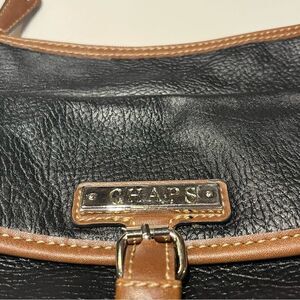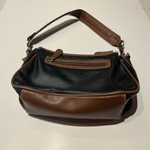One outer zip compartment and one outer snap compartment. See photos. One large middle compartment with 2 pouches and zipper.