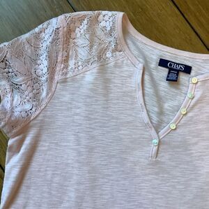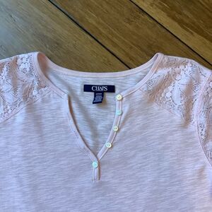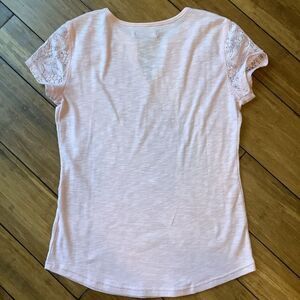 Extra soft and softly pink short sleeve top with cute lace details to shoulders. 100% cotton. Size small. Cute with jeans!