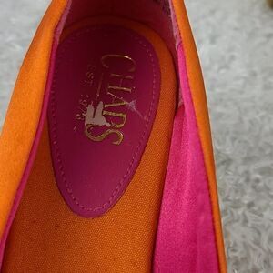 7.5 Orange Satin fabric Great condition except for Chaps label on inside heel. Look at last pic!