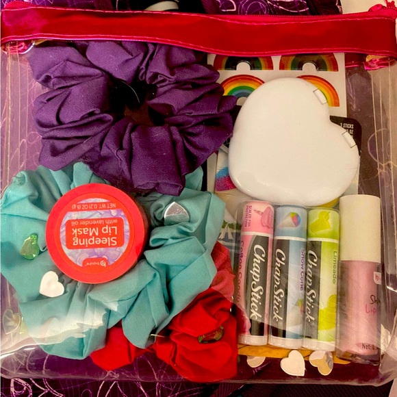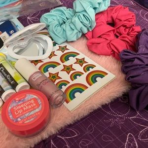 This cute bundle comes with 3 vacation getaway chapsticks, 3 scrunchies, a compact mirror, sleeping lip mask, some cute shimmer lip gloss and some adorable rainbow and stars stickers. Perfect for a niece or daughter or any little one who loves girly things.