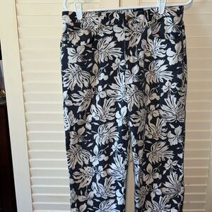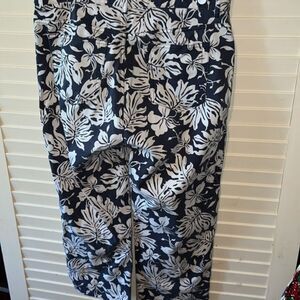 Chaps tropical floral cropped pants, blue and white, made of a cotton spandex mix, size 10, measures 16 inches across the waist with an inseam of 21 inches