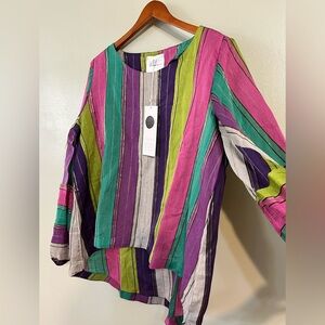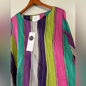 Vibrant and stylish, this top features bold stripes in purple, green, and pink. Perfect for adding a pop of color to your wardrobe. Chapter 2 Colorful Striped Women's Top Hand woven Silk Bland Boho Festival L NWT See Pictures For Details and Measurements (52)