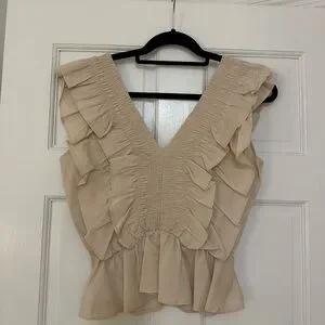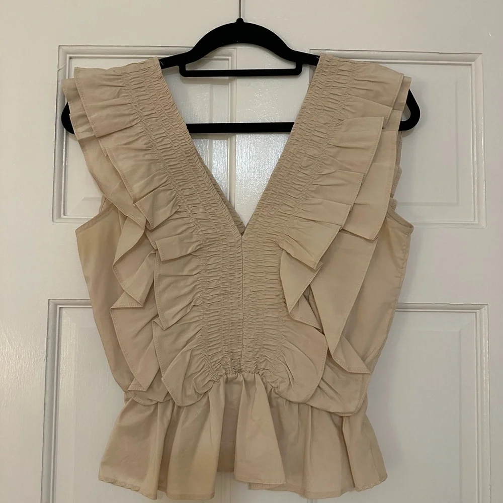 Chic beige blouse with ruffle details. Perfect for versatile styling.