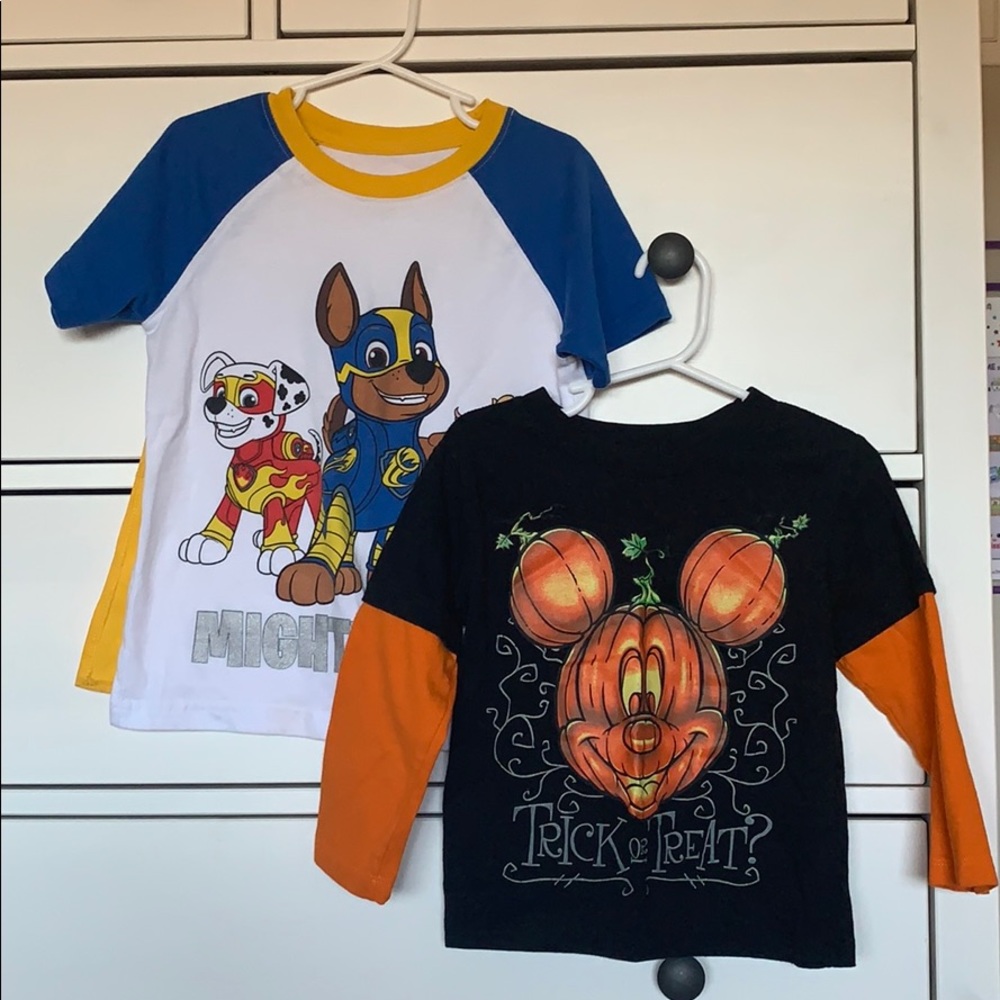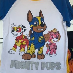 Paw Patrol Mighty Pups tee (4T), good condition, cape has some discoloration. Perfect for upcoming Halloween dress up!