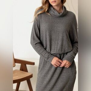 women’s dresses, grey, solid color, flannel material, turtle neckline, elasticized waistband, long cuffed sleeves, two pockets side, midi length, relaxed fit, not see through, stretchy, warm, comfy, cozy, fall, winter, everyday look, trendy