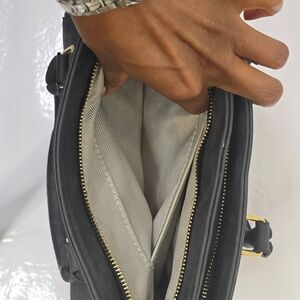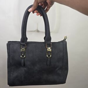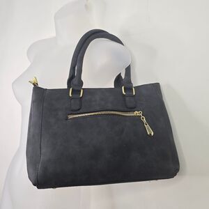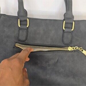 New without tags. This elegant off black/deep gray smooth leather like handbag is perfect for any occasion. Its sleek design and versatile color make it a must-have accessory. Shoulder straps tore and were removed. Stitching holes are visible up close. 1 exterior zipper pocket, 2 zipper closure compartments with 2 interior pockets. Gold hardware.
